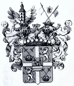 1720/1909: Schild durch ein goldenes Tatzenkreuz quadriert mit Herzschild, darin über von Silber und Rot dreimal geteiltem Schildesfuß in Blau auf grünem Rasen eine silberne Kirche mit rotem Dach und silbernem Kreuz, aus deren Tor ein silberner Bach fließt, im rechten oberen Eck eine strahlende goldene Sonne. 1 und 4 in Blau unter zwei geschrägt golden begrifften, silbernen Schwertern eine goldene Adelskrone, 2 und 3 in Rot je ein rechtsgekehrter aufgerichteter silberner Löwe (nach einigen: Leopard). Auf dem Schild ruht die Freiherrnkrone, darüber zwei Helme: Auf dem rechten zwischen offenem, von Silber und Rot übereck geteiltem Fluge ein silberner Kirchturm mit rotem Dach; auf dem linken zwischen zwei Fähnchen an goldenen Turnierlanzen mit je zwei goldenen Troddeln, das rechte silbern mit blauem Rand, das linke blau, eine goldene Lilie. Die Decken sind blau-golden. In Darstellungen mit Schildhalter: Zwei vorwärtssehende natürliche Löwen (bzw. Leoparden).[11][12]