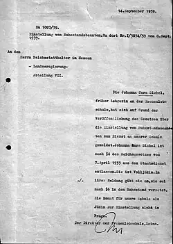1939 versuchte Johanna Sichel vergeblich, wieder in den Staatsdienst aufgenommen zu werden. Sie berief sich in ihrem Antragschreiben vom 8. September 1939 auf das „Gesetz über die Einstellung von Ruhestandsbeamten“. In einem Schreiben an den Reichsstatthalter in Hessen vom 14. September 1939 in dieser Angelegenheit unterstrich der Direktor der Frauenlobschule (Die Höhere Mädchenschule wurde 1938 in Frauenlob Gymnasium umbenannt) persönlich, den Johanna Sichel zwangsweise verliehenen zweiten Vornamen „Sara“ und weist darauf hin, dass sie, auch durch den behördlich verordneten Zweitnamen, „Volljüdin“ sei. Er schließt sein Schreiben mit den Worten: