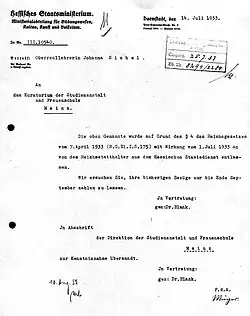 Nach 31 Jahren (1902 bis 1933) Dienst, zuletzt als Oberreallehrerin an der Höheren Mädchenschule Mainz, wurde Johanna Sichel mitten im Schuljahr 1933 vorläufig aus dem Schuldienst entlassen. Ein Schreiben des Hessischen Staatsministeriums, datiert vom 14. Juli 1933, wies das Kuratorium der Studienanstalt und Frauenschule Mainz an, Johanna Sichel rückwirkend zum 1. Juli 1933 in den vorläufigen Ruhestand zu versetzen. Begründet wurde dies mit dem am 7. April 1993 in Kraft getretenen Gesetz zur Wiederherstellung des Berufsbeamtentums und dessen § 4: