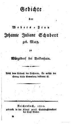 - ↑ Vorerinnerung, in: Gedichte der Webers=Frau Johanne Juliane Schubert geb. May, zu Würgsdorf bei Bolkenhain. Nebst dem Bildniß der Dichterin, für welche der Ertrag dieser Sammlung bestimmt ist, Reichenbach, 1810. gedruckt in der Königl. privil. Stadtbuchdruckerei bei Ernst Müller.