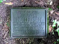 Eine Bronze-Grabplatte im Bereich der Familiengrabanlage auf dem Ohlsdorfer Friedhof (Planquadrat Y 11) erinnert an Johannes Holthusen.