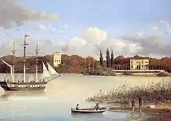 - Ansicht des Glienicker Ufers mit Casino, Fregatte und Wasserturm, 1847