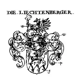 1485 erschien sein Werk Practica Meyster Johannen Lichtenbergers, so er vor etzlichen Zeit gemacht hat, vonn der grossen Conjunction Saturni und Jovis im vergangenen Jahre 1484. Desgleichen eclipsis etc. nebst weissagungen und ein gesichte Bruder Clausen. Kaiser Friedrich III. verlieh ihm offenbar aus Veranlassung dieses Werks mit Wappenbrief ein redendes Wappen, das den Familiennamen in der Weise darstellt, dass in einem roten Schild ein silberner Greif mit der rechten Klaue ein brennendes Licht (Fackel) emporhält und auf den Spitzen von drei goldenen Bergen im Schildfuß steht. Auf dem Helm mit rot-silbernen Helmdecken der Greif wachsend, die Fackel mit beiden Klauen emporhaltend.[1] Das Wappen ist in einem der Nachfolgebände von Johann Siebmachers Wappenbuch vom Anfang des 18. Jahrhunderts abgebildet, beim österreichischen Adel.