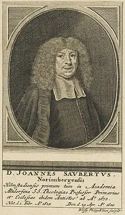Johannes Saubert, geboren und aufgewachsen in Nürnberg als Sohn des Theologen und Stadtbibliothekars Johannes Saubert des Älteren. Johannes Saubert d. J. begann seine theologischen Studien an der Universität Altdorf, die er 1657 bis 1659 in Jena fortsetzte. Am 27. Oktober 1659 immatrikulierte er sich zunächst an der Universität Helmstedt und erhielt dort schon am 24. Dezember 1660, noch nicht 23 Jahre alt, eine ordentliche Professor für orientalische Sprachen. In Nachfolge von Georg Calixt bekam er am 10. November 1665 eine theologische Professur, für das Lehrfach des Alten Testaments.