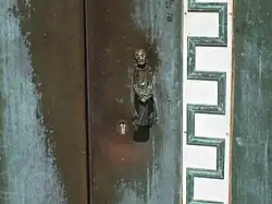 Der Türgriff mit einer Darstellung des Evangelisten Johannes (Teilansicht der Eingangstür)