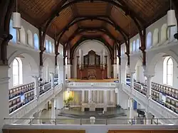 Der Innenraum verfügt über umlaufende Emporen, die auf Säulen mit Kompositkapitellen ruhen. Die zweite Säulenreihe auf Emporenhöhe trägt Segmentbogen-Arkaden, über denen sich eine Reihe von Oberlichtern befinden. Über dem Kirchenschiff erstreckt sich eine bemalte Holzdecke, deren tragende Verstrebungen in Form eines Rundbogens mit Schnitzwerk verziert sind. Die Konsolen nehmen die für die Renaissance typische Muschelform auf. Auf der Nordempore befindet sich die Orgel. Ihrer Empore ist die postmodern ausgestaltete Liturgiezone mit Gabentisch und Taufstein vorgelagert. Der Taufstein stammt aus der Bauzeit und ist mit rundbogenförmigen Kartuschen verziert. Eine Bestuhlung aus jüngerer Zeit ersetzt die ursprüngliche Kirchenbänke und erlaubt eine flexible Nutzung des Kirchenraums.