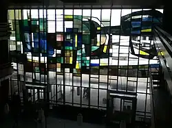 Neben dem Schulhof befindet sich eine Cafeteria, dessen Wände aus großen Glasplatten bestehen, die durch einzelne Verstrebungen stabilisiert werden, so dass sie stark ausgelichtet ist.