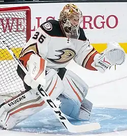 | 2016/17 | Anaheim Ducks | NHL | 52 | 25 | 16 | 9 | 2951 | 109 | 6 | 2,22 | 92,4 | 16 | 9 | 5 | 879 | 38 | 0 | 2,59 | 91,8 | ||