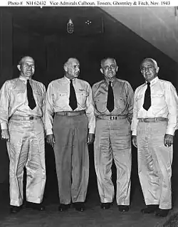 Vizeadmiral John Henry Towers (2. v. l.) als Kommandeur der Lufteinheiten der US-Pazifikflotte mit Vizeadmiral William L. Calhoun, Kommandeur der Serviceeinheiten der Pazifikflotte, Vizeadmiral Robert L. Ghormley, Kommandant des 14. Marinebezirks und Vizeadmiral Aubrey W. Fitch, Kommander der Lufteinheiten der US-Streitkräfte im Südpazifik, am 14. November 1943 im Hauptquartier der US-Pazifikflotte in Pearl Harbor