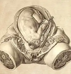Im Winter 1750 erhielt William Hunter den Leichnam einer Frau zur Sektion, die im neunten Monat schwanger gewesen war.[18] Das bot William und John Hunter die seltene Gelegenheit, eine Frau im letzten Stadium der Schwangerschaft zu sezieren. Auch war der Zeitpunkt günstig, denn im Winter setzte die Verwesung viel später ein als in den warmen Sommermonaten. Mit dem jungen Niederländer Jan van Riemsdyk gewann William Hunter einen begabten Zeichner, dessen Aufgabe es war, jeden Schritt der anatomischen Untersuchung bildlich festzuhalten. Da hauptsächlich John Hunter die Aufgabe des Sezierens zufiel, trug William nicht allzu viel zu dem gemeinschaftlichen Werk bei.