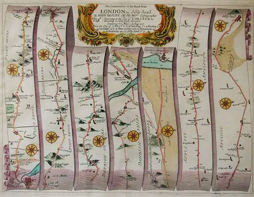 Sechs Monate nach der Abfassung des Testamentes erschien die Britannia im Druck. Neben den Streifenkarten enthielt der große Folioband kurze Beschreibungen der wichtigsten englischen Städte. Mit seinem Umfang, seiner aufwändigen Form der Datenerhebung sowie der originellen Art der Darstellung setzte er neue Maßstäbe in der Herstellung von Straßenatlanten in Großbritannien.[53] Ganz anders als die früheren Bände der Cosmography mit ihren phantasiereichen Beschreibungen fremder Länder und ihren bisweilen bizarren Abbildungen enthielt er faktenbasierte und nützliche Informationen für Reisende. Die Tatsache, dass heute zahlreiche der in der Britannia enthaltenen Streifenkarten, herausgelöst aus dem Gesamtwerk, in verschiedenen Sammlungen überliefert sind, deutet auf den Umstand, dass viele Besitzer der großformatigen Britannia diese tatsächlich im Reisealltag benutzt haben.[54] Mit seiner spezifischen Art der Darstellung bestimmte Ogilbys Britannia Straßenpläne bis weit ins 18. Jahrhundert und gilt heute als Meilenstein in der Entwicklung von Straßenatlanten.[55]