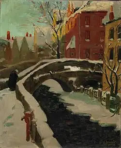 John Young Johnstone ist vor allem für seine Landschaften, Stadtansichten und Porträts bekannt.[2] Aufgrund der relativ kurzen Zeit, in der er aktiv malte, sind Johnstones Werke relativ selten, und über sein Leben ist wenig bekannt. Sein Malstil wurde als eine Mischung aus vereinfachtem Realismus und impressionistischen Einflüssen beschrieben. Sein Werk lässt sich in zwei Perioden einteilen, die sich teilweise überschneiden. Seine frühere Periode, die von 1911 bis 1915 dauerte, zeigt einen strukturierteren und farbenfroheren Stil. In dieser Zeit verwendet er eine Reihe von Techniken, die von den Impressionisten beeinflusst sind. Seine spätere Periode ab 1916 ist durch eine gedämpfte Farbpalette und eine Melancholie gekennzeichnet, die sich auch in seinem Privatleben widerspiegelt. Während er weiterhin impressionistische Einflüsse zeigt, bringt er auch seine eigene Sichtweise in seine Themen ein.[1]