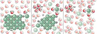 Das (greifbare und sichtbare) Makrophänomen des Lösens von Salz in Wasser wird dadurch erklärt, dass das Salz in einem regelmäßigen Gitter vorliegt, von den Wassermolekülen angezogen und in die Lösung gebracht wird. Der Lösungsprozess wird dann bspw. als dargestellt.[2] In der nachfolgenden Tabelle sind u. a. die drei Repräsentationsebenen zum Lösungsprozess eines Salzes dargestellt.