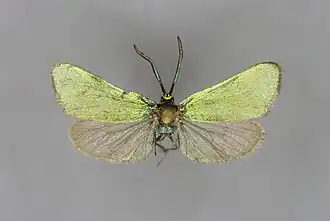 Die Falter erreichen eine Vorderflügellänge von 10,0 bis 12,8 Millimeter bei den Männchen und 8,0 bis 10,8 Millimeter bei den Weibchen. Kopf, Thorax und der proximale Teil der Beine schimmern grün, das Abdomen schimmert bläulich grün oder blau. Die Stirn (Frons) ist ungefähr 1,5-mal breiter als die Facettenaugen. Die Fühler schimmern blau oder bläulich grün und bestehen aus 35 Segmenten auf Sizilien und 48 Segmenten in den Abruzzen. Der Fühlerschaft ist an der Basis etwas schlanker. Die Vorderflügeloberseite schimmert grün oder bläulich grün. Der Hinterflügel ist dunkelgrau und leicht transluzent. Die Flügelunterseiten sind grau. Der Vorderrand des Hinterflügels ist mit metallisch glänzenden Schuppen besetzt.