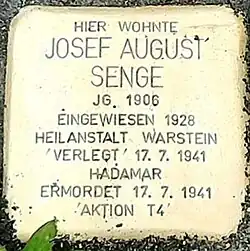 Am 25. Juli 1928, im Alter von 22 Jahren, wurde er in die Provinzialheilanstalt Warstein eingewiesen. Kostenträger war der westfälische Landesfürsorgeverband. Von dieser Anstalt wurde Josef August Senge am 27. Juni 1941 in die psychiatrische Landesheilanstalt Herborn verlegt und am 17. Juli 1941, 35 Jahre alt, von Herborn nach Hadamar, wo er ebenso wie andere an diesem Tag dorthin verlegte Patienten unmittelbar nach seiner Ankunft ermordet wurde.[1]