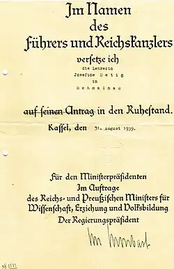 In den folgenden zwei Jahren musste sie mindestens zehn bis zu vier Stunden lange Verhöre, Ermittlungsverfahren und Hausdurchsuchungen über sich ergehen lassen. Bei einer dieser Durchsuchungen wurde der Text eines Referats zum Erhalt der Bekenntnisschulen, das sie im Auftrag des Vereins katholischer Lehrerinnen gehalten hatte, gefunden. Sie hatte in einem anderen Verhör auf die Frage, ob sie gegen nationalsozialistische Gesetze verstoßen würde, falls es ihr Bischof befehlen würde, geantwortet, dass sie ihrem Gewissen folgen würde. Obwohl ihr bescheinigt wurde, dass gegen ihre dienstlichen Leistungen nichts einzuwenden sei, wurde sie daraufhin als „politisch unzuverlässig“ und für „die nationalsozialistische Schule nicht verwendungsfähig“ zum 1. September 1939 aus dem aktiven Schuldienst entlassen und in den Ruhestand versetzt. Als Folge der Schikanen hatte sie gesundheitliche Probleme und Herzbeschwerden, unter denen sie bis an ihr Lebensende litt. Sie zog danach um nach Fulda, wo sie zur Untermiete wohnte, und betätigte sich im Bischöflichen Generalvikariat auf religiös-caritativem Gebiet.[2]