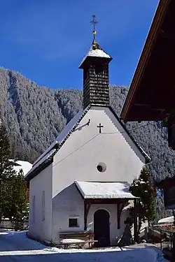 Die Kapelle hat einen rechteckigen Grundriss mit einem polygonalen Chor und ist mit einem steilen, schindelgedeckten Satteldach versehen. Über der Eingangsseite im Westen ist ein Schindel gedeckter Dachreiter mit einem leicht geschwungenen Pyramidendach und rundbogigen Schallfenstern, an der Spitze eine Kugel, Kreuz und Sonne. Ursprünglich befanden sich im Turm zwei Glocken, die 1764 bzw. 1858 von Johann Grassmayr in Brixen gegossen wurden. Eine weitere wurde von Josef Dengg in Jenbach hergestellt. Die Glocken wurden während der beiden Weltkriege eingeschmolzen und später durch neue ersetzt. Eine Glocke aus dem 15. Jahrhundert befindet sich unter dem Vordach.