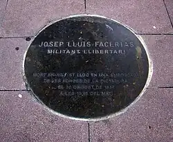 Josep Lluís Facerias. Libertärer Aktivist. Starb an diesem Ort am 30. August 1957 um 10.45 Uhr in einem Hinterhalt der Diktatur.