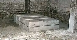 In der Abteikirche wurde Hergenröther 1897 von Abt Augustin Stöckli[8] ein Denkmal errichtet, zu dem die 42. Generalversammlung der Katholiken in Deutschland 1895 in München den Anstoß gegeben hatte. Es stand ursprünglich, von zwei Altären flankiert, in der linksseitigen Ecke des Querschiffs. Auf dem Sarkophag ruhte die lebensgroße Gestalt des Kardinals im Purpurgewand, aus Salzburger Marmor gefertigt. Darüber befanden sich sein Wahlspruch aus dem Te Deum, In te domine speravi (lateinisch Auf Dich, Herr, habe ich gehofft), eine Mariendarstellung, der hl. Josef und zwei Engel. Das Denkmal wurde von Balthasar Schmitt in München gefertigt.