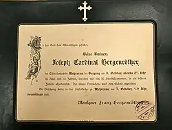 Hergenröther, dessen Gesundheitszustand schon in den 1870er Jahren angegriffen war, erlitt am 24. Februar 1882 einen Schlaganfall, von dem er sich weitgehend erholte. 1883 berief ihn der Papst in die Kardinalskommission für die Historischen Studien.[7] Am 1. Oktober 1890 erlitt er dann bei einem Aufenthalt in der Zisterzienserabtei Mehrerau einen zweiten Schlaganfall, an dessen Folgen er zwei Tage später verstarb.