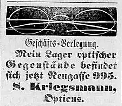 Für seinen Sohn Siegmund annoncierte Kriegsmann 1858 die Eröffnung eines eigenen Geschäfts in Bonn, des Optischen Instituts von S. Kriegsmann am Römerplatz 35 a.[31] Zwei Jahre später verlegte es der Inhaber in die Neugasse 995;[32] 1863 hatte Siegmund Kriegsmann ein Verkaufslokal Belderberg No. 67.[33] Nach dem Tod seines Bruders Adolph firmierte Joseph Kriegsmann 1853 wieder als „Hof-Opticus aus Magdeburg und Köln“.[34] Carl, wohl sein zweitältester Sohn, wurde möglicherweise im Magdeburger Geschäft ausgebildet.[35] Das Lager mit optischen und mechanischen Instrumenten wurde 1857 an den Optiker Adam Walter verkauft, der noch lange an dem eingeführten Namen festhielt und „vormals Gebr. Kriegsmann“ hinter den eigenen Namen setzte.[36] Joseph Kriegsmanns Sohn Siegmund und die Witwe Marianne Kriegsmann, geb. Schwabe († September 1879),[37] annoncierten die Übernahme von Activa und Passiva der Firma „Gebr. Kriegsmann“ durch Siegmund Kriegsmann.[38]