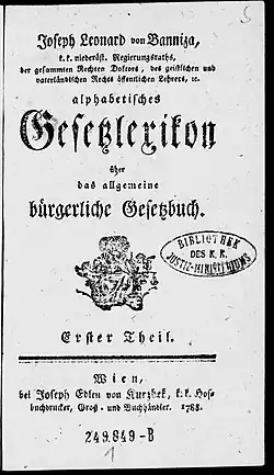 - Joseph Edlen von Kurzbek (Hrsg.): Alphabetisches Gesetzlexikon über das allgemeine bürgerliche Gesetzbuch. Wien 1788 (Online [abgerufen am 27. Mai 2020]).
