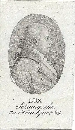 Am 7. Juli 1792 gab Lux sein Debüt in Frankfurt am Main, wo ihn Goethe hörte. Er charakterisierte ihn als eine „gedrängte gut gebildete Mittelgestalt“ und einen Schauspieler, der „weiß, seine Kleider und Gebärden nach den Rollen zu motivieren“. Lux gehörte auch in Frankfurt bald zu den beliebtesten Schauspielern, wie ein Bericht aus Frankfurt vermeldet: