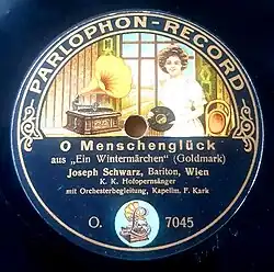 Die erste Schallplatte von Joseph Schwarz erschien 1906 in Wien bei Zonophone, es folgte eine Edison-Walze (Wien 1907), dann Schallplatten bei Pathé (Wien 1910–1911), Parlophon (Wien 1911 und Berlin 1913) und Grammophon (Berlin 1916–19). Ende 1926 wurde eine Vox-Platte mit Weihnachtsliedern angekündigt, die aber wohl nie erschienen ist.[2]