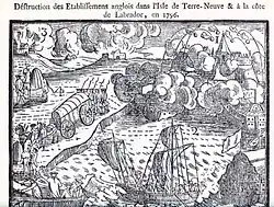 Richerys Angriff auf die englischen Siedlungen in Neufundland im Jahr 1796. Zeitgenössischer Holzschnitt. Iconographie Bibliothèque Nationale.