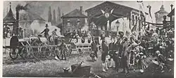 Regierungspräsident Joseph von Stichaner (Vordergrund Mitte, mit Frack, Degen, Beamtenhut und weißen Kniebundhosen) eröffnet als Vertreter des Königs die 1. Deutsche Eisenbahn zwischen Nürnberg und Fürth, am 7. Dezember 1835.