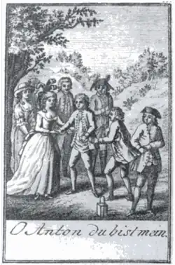 Josepha Hofer vorne links, Hände haltend mit dem Tenor Benedikt Schack sowie weiteren Protagonisten des Wiedner Theaters in Schikaneders Singspiel Die Zween Anton (in der Nummer „O Anton du bist mein“).