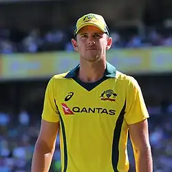 Ein Jahr später im ersten Test der Serie gegen Indien konnte er mit 5 Wickets für 8 Runs dazu beitragen das Indien im zweiten innings nur 38 Runs erreichte und erzielte dabei sein 200. Test-Wicket.[24] Im vierten Test der Serie erreichte er 5 Wickets für 57 Runs, was jedoch nicht zum Sieg reichte.[25] Im November 2021 spielte er dann beim ICC Men’s T20 World Cup 2021 und konnte dort in der Vorrunde gegen die West Indies 4 Wickets für 39 Runs erreichen.[26] Im Finale gegen Neuseeland trug er dann 3 Wickets für 16 Runs zum Titelgewinn bei.[27] Zum Jahresende hatte er dann mit Verletzungen zu kämpfen.[28] Zurück im Team erreichte er in den Twenty20s gegen Sri Lanka ein Mal vier (4/12) und ein Mal drei Wickets (3/22), wobei er beim letzteren das Super Over für Australien entscheiden konnte und ausgezeichnet wurde.[29][30] Beim Gegenbesuch in Sri Lanka im Juni 2022 gelangen ihm erneut vier Wickets (4/16).[31] Daraufhin stieg er auf den ersten Platz in der Twenty20-Bowling-Weltrangliste des Weltverbandes auf.[32] Gegen Neuseeland gelangen ihm in der ODI-Serie im September drei Wickets (3/31).[33] In der Vorbereitung für die Weltmeisterschaft konnte er dann in der Twenty20-Serie gegen die West Indies abermals drei Wickets (3/35) erzielen.[34] Beim ICC Men’s T20 World Cup 2022 selbst konnte er gegen Neuseeland (2/41) und Afghanistan (2/33) jeweils zwei Wickets erreichen.[35][36]