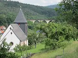 Das Ortsbild ist durch den Jossaviadukt geprägt, eine ursprünglich vierbögige Eisenbahnbrücke über die Jossa, kurz vor deren Einmündung in die Sinn. Nachdem sie von Truppen der Deutschen Wehrmacht am 4. April 1945 gesprengt wurde, konnten die amerikanischen Besatzungstruppen sie bereits am 27. Mai 1945 behelfsmäßig wieder instandsetzen, um die wichtige Nord-Süd-Bahnlinie wieder befahrbar zu machen. Eine Neubrücke wurde schließlich am 27. Oktober 1951 eingeweiht. Diese Betonbrücke, erbaut von der Firma Bödicker aus Dörnigheim, bestand nun aus zwei statt drei Pfeilern und drei statt vier Rundbögen.[2] Sie überquert das Jossatal in 32 Metern Höhe und ist Bestandteil der alten Nord-Süd-Strecke Fulda–Würzburg. Zum Teil verkehren auch Güterzüge der Relation Frankfurt–Würzburg über Jossa.
