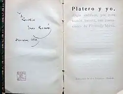 • Platero y yo („Platero und ich“), Kurzfassung, mit Illustrierungen von Fernando Marco, Biblioteca de la Juventud, Talleres de La Lectura, Madrid 1914