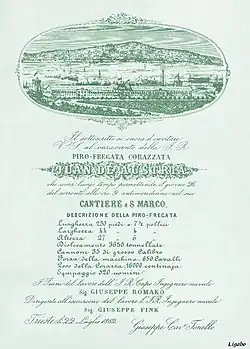 Die Juan de Austria lief 1862 bei der „Cantiere a San Marco“ in Triest vom Stapel. Sie war 70 m lang, verdrängte 3588 Tonnen, und hatte drei Masten und einen Schornstein. Die Maschine leistete 1900 PS und erlaubte eine Höchstgeschwindigkeit von 11,0 Knoten. Der Gürtelpanzer war 110 mm dick. Das Schiff war mit 16 48-Pfünder-Glattrohrkanonen, 15 gezogenen 24-Pfündern des Kalibers 15 cm sowie jeweils einem 12-Pfünder- und 6-Pfünder-Geschütz bewaffnet. Die Besatzung bestand 1866 aus 386 Mann. Die Hauptbewaffnung wurde 1867 durch zwölf 17,8-cm-Geschütze ersetzt.
