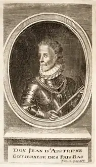 Stattdessen bat Philipp II. ihn, sein Statthalter in den Niederlanden zu werden, die sich seit 1568 im offenen Aufstand befanden. Nach dem Tod des bisherigen Amtsinhabers, Don Luís de Zúñiga y Requesens drohte die Lage zu eskalieren. Don Juan reiste zunächst nach Spanien, um seine Heiratspläne mit Philipp zu besprechen. Diesem gelang es, Don Juan zur Annahme der Generalstatthalterwürde zu bewegen. So verließ er Spanien im Oktober 1576 wieder und reiste zunächst nach Luxemburg, wo er seine Mutter zum ersten Mal seit seiner frühen Kindheit wiedersah; er bewog sie, dem Wunsch Philipps II. zu folgen und in ein spanisches Kloster zu ziehen. Am 12. Februar 1577 unterzeichnete Don Juan mit den niederländischen Generalstaaten das Ewige Edikt und konnte am 1. Mai 1577 in Brüssel einziehen[1]. Er begann zunächst mit dem Abzug der verhassten spanischen Truppen, konnte sich aber nicht behaupten, zog sich nach Namur zurück und besetzte in einem Handstreich die Zitadelle von Namur. Da Philipp die Soldzahlungen verweigerte, begann Don Juan heimlich mit geliehenem Geld ein Heer aufzustellen.
