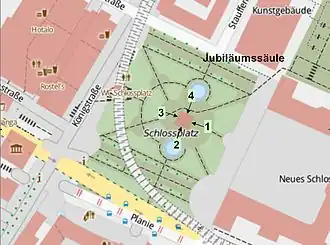 Das quadratische Areal um die Jubiläumssäule wird durch dornbewehrte Eisenketten, die an massiven Granitpfosten aufgehängt sind, vom übrigen Schloßplatz abgetrennt. Die 27,5 Meter hohe Jubiläumssäule besteht aus zehn Granitblöcken von je 100 Zentnern Gewicht,[3] die in einem Steinbruch in der Teufelsküche zwischen Alpirsbach und Schenkenzell gebrochen wurden.
