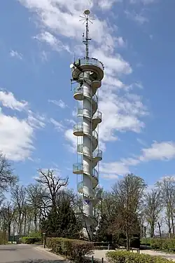 Auf der und um die Aussichtsplattform herum befinden sich eine Reihe von Richtfunkantennen.