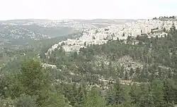 Auch aus klimatischen Gründen sind Wohnorte im Bergsattel Jerusalems begehrt, entsprechend aber auch keine billigen Wohnlagen. Dort wohnen vor allem Familien der Mittelklasse, so etwa wie Mevasseret Zion, ab 1951 angelegt auf dem Gebiet des im Krieg um Israels Unabhängigkeit entvölkerten Qalunya, das Vespasian an Stelle des im Jüdischen Krieg (66–70) entvölkerten Ha-Moṣa als Colonia Amosa mit 800 römischen Soldaten und Familien besiedelte, denen oblag, den Korridor nach Jerusalem militärisch zu sichern.[2]:792So breitet sich die Großstadt in alle Richtungen aus, wobei die Ausläufer des aufgeforsteten Jaʿar Jerūschalajim / יַעַר יְרוּשָׁלַיִם / ‚Wald Jerusalems‘ in tief eingeschnittenen Tälern als Grüne Lunge in die westlichen Außenbezirke hineinragen.