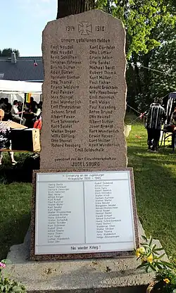 Im Ehrenhain des Dorfes befindet sich ein Kriegerdenkmal für die Opfer des Ersten Weltkriegs, das um 1920 von den Bewohnern errichtet wurde. Nach Umgestaltung durch die Nationalsozialisten zu einer Gedenkstätte der Nationalen Erhebung wurde es nach dem Zweiten Weltkrieg in der DDR dem Verfall preisgegeben. Erst im Jahr 2011 wurde es durch Spenden der Einwohnerschaft restauriert und 2012 um die Namen der Gefallenen des Dorfes im Zweiten Weltkrieg ergänzt.