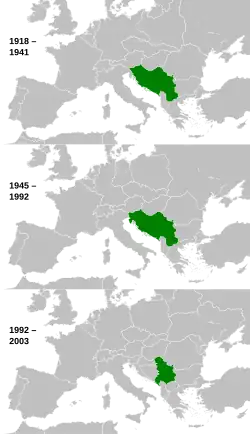 Von 1918 bis 1941 existierte das Königreich Jugoslawien („Erstes Jugoslawien“), danach bestand von 1945 bis 1992 die Sozialistische Föderative Republik Jugoslawien („Zweites Jugoslawien“). Während der Jugoslawienkriege bildete sich von 1992 bis 2003 aus Serbien und Montenegro die Bundesrepublik Jugoslawien, gefolgt 2003 bis 2006 vom territorial und völkerrechtlich identischen Staatenbund Serbien und Montenegro („Restjugoslawien“).