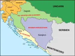 Das Königreich Kroatien und Slawonien, 1867 Transleithanien zugeschlagen hatte aber einen gewissen autonomen Status darin. Das Königreich Dalmatien gehörte zu Cisleithanien.[9]
