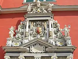 Das Hauptportal an der südlichen Gebäudeseite befindet sich direkt neben dem Turm und ist mit fünf Figuren der sieben freien Künste (Septem artes liberales) geschmückt: „Astronomie“ mit Himmelskugel (Portalspitze), „Grammatik“ mit Griffel und Tafel (zweite Reihe links), „Arithmetik“ mit Tafel und Zahlen (zweite Reihe rechts), „Musik“ mit Laute (untere Reihe links) und „Geometrie“ mit Zirkel und Rolle (untere Reihe rechts). Es fehlen die Figuren „Rhetorik“ und „Dialektik“, die wahrscheinlich früher links und rechts neben der Tür in den Muschelnischen standen. Die Statuen symbolisieren die philosophische Fakultät. Ebenfalls über dem Portal ist das Universitätswappen angebracht, das die biblische Figur Simson darstellt, wie sie aus einem toten Löwen Honig entnimmt (Buch der Richter 14, 14: „…vom Starken kommt Süßes“ – häufige Deutung: Wer die Stärke der Wissenschaft [Löwe] besitzt, gewinnt den Reichtum der Erkenntnis [Honig]).