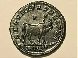 Die bekannteste unter Julian geprägte Münze zeigt ihn mit Bart auf der Porträtseite und einem Stier auf der Rückseite. Der Bart wird häufig als Bekenntnis zur griechischen Philosophie gedeutet. Der Stier wird auch als Apisstier und damit als Symbol für die von Julian wieder geförderten blutigen Tieropfer für die alten Kulte interpretiert,[13] welche die klare Abgrenzung vom Christentum demonstrieren sollten.[14]