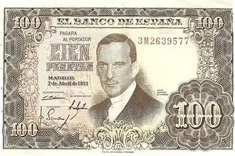 Sein Bildnis erscheint auf einer 100-Pesetas-Banknote, Madrid 7 de Abril de 1953; die Rückseite zeigt eine junge Spanierin.