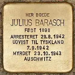 1937 war Barasch Hauptverantwortlicher einer Ausstellung über den Spanischen Bürgerkrieg und geriet unter anderem dadurch wieder besonders in den Fokus der Polizei. Am 29. August 1942 wurde Barasch schließlich auf Grund seiner politischen Aktivitäten verhaftet und am 7. September 1942 zusammen mit seiner Frau nach Deutschland abgeschoben. Sie kamen in Warnemünde an und wurden von dort nach Berlin verbracht. Irma Barasch kam in ein Sammellager, wurde nach Auschwitz deportiert und 1943 ermordet.[6] Auch Julius Barasch wurde zu einem unbekannten Zeitpunkt nach Auschwitz deportiert und hier am 23. Oktober 1943 ermordet.