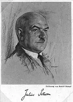 Julius Petersen ist der Sohn des Reichstagsabgeordneten und Reichsgerichtsrates Julius Petersen. Er besuchte die Nikolaischule in Leipzig, an der er 1897 die Abiturprüfung bestand. An der Universität Lausanne und der Ludwig-Maximilians-Universität begann er Deutsche Philologie, Kunstgeschichte und Philosophie zu studieren. 1898 wurde er im Corps Suevia München recipiert.[1] Als Inaktiver wechselte er an die Universität Leipzig und die Friedrich-Wilhelms-Universität zu Berlin. Zu seinen Lehrern gehörten Albert Köster, Wilhelm Dilthey, Erich Schmidt und Heinrich Wölfflin. Mit einer Doktorarbeit bei Gustav Roethe wurde er 1903 in Berlin zum Dr. phil. promoviert.[2] 1909 habilitierte er sich bei Hermann Paul in München.[3] Er war zwei Jahre Privatdozent und erhielt 1911 ein Extraordinariat für Germanische Philologie. 1912 wechselte er an die Yale University in New Haven und von dort im August desselben Jahres an die Universität Basel. 1914/15 war er Professor für Neuere deutsche Sprache und Literatur an der neuen Johann Wolfgang Goethe-Universität Frankfurt am Main. Nach dem Ersten Weltkrieg kehrte er 1920 an die Universität Berlin zurück, wo er die Nachfolge von Erich Schmidt als Professor für Neuere Deutsche Literaturgeschichte antrat. 1920 bis 1933 war Petersen Kodirektor, 1933 bis zu seinem Tod 1941 Direktor des Germanischen Seminars. Ab 1923 leitete er mit Max Herrmann, ab 1933 allein das neu gegründete Theaterwissenschaftliche Institut. Vortragsreisen führten ihn nach Portugal (1927), Nordamerika (1933), England und Estland (1935).