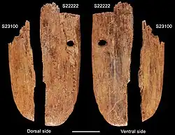 Die Entwicklung von einfachen ornamentierten Gegenständen in Afrika bis zu figürlichen Kleinkunstwerken des europäischen Aurignacien, die hier erst etwa vor 40.000 Jahren belegt sind, ist sehr wahrscheinlich ein kontinuierlicher Prozess im Sinne einer Tradition.[11][12] In Europa gibt es im Zeithorizont des Übergangs vom Mittelpaläolithikum zum Jungpaläolithikum eine Reihe ornamentierter Objekte, die sowohl Innovationen später Neandertaler sein können (Châtelperronien), als auch auf Interaktionen mit dem eingewanderten Homo sapiens zurückgeführt werden könnten.[13] Eingeritzte Ornamente spielen bei Kunstwerken des Cro-Magnon-Menschen eine große Rolle, wo sie die Elfenbein-Kleinkunst (vgl. Venus vom Hohlen Fels) dekorieren oder als Petroglyphen auf Felswände aufgebracht wurden. Zu den ältesten derartigen Funden gehört ein als Schmuckanhänger interpretierter, nur 3,7 Millimeter dicker, bearbeiteter Mammutknochen aus der Stajnia-Höhle in Polen, der durch mehr als 50 aneinander gereihte Einstiche, angeordnet zu einer Seilkurve wie bei einer herabhängenden Halskette, verziert wurde.