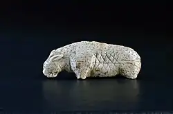 Tierfigur aus der Vogelherdhöhle, die als Schneeleopard gedeutet wird und im Museum der Universität Tübingen präsentiert wird -