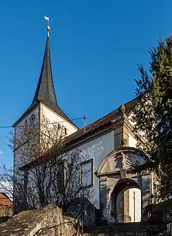 Die evangelisch-lutherische Pfarrvikariatskirche St. Veit ist eine Chorturmkirche. Das barocke Langhaus ist ein Saalbau mit einem Satteldach und wird auf 1738 datiert. Das Sockelgeschoss des Chorturms stammt aus dem 8. bzw. 9. Jahrhundert. Im Chor befinden sich Wandmalereien und Fresken aus der Zeit um 1450. Die Orgel wurde 1848 von Christoph Hofmann aus Neustadt aufgestellt.
